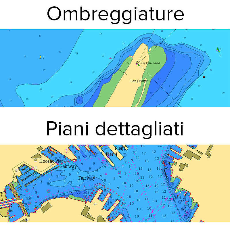 La cartina nautica C-Map 4D offre una gamma completa di informazioni, tra cui profondità, contorni, punti di scandaglio, aiuti alla navigazione (NavAids), settori luce, relitti, ostacoli e altro ancora. Visualizzano il livello più alto di dettagli, consentendo di impostare profondità di sicurezza e di identificare pinnacoli sottomarini, sporgenze e canyon, che fungono da magneti per la fauna costiera.