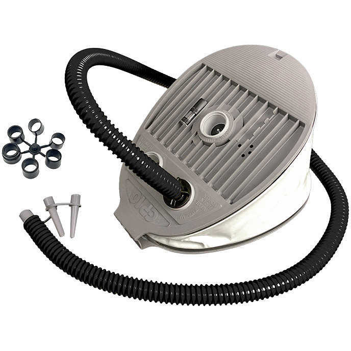 Pompa a pedale Bravo10 a doppia camera . Gonfiando con la prima camera si riesce a portare rapidamente in forma il gommone. Utilizzando la seconda camera (più piccola) potrai, senza sforzo , portare il gommone ad una pressione massima di 300 mbar.
