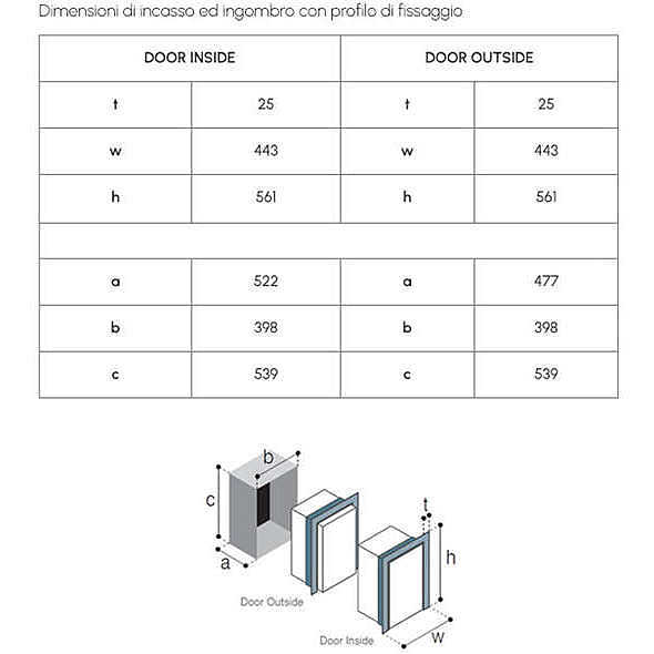 Grazie al profilo di fissaggio (di serie) è possibile scegliere la posizione dell'anta, che può essere a filo interno o a filo esterno.