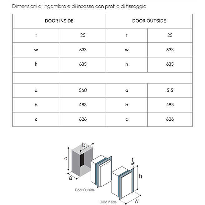 Grazie al profilo di fissaggio (di serie) è possibile scegliere la posizione dell'anta, che può essere a filo interno o a filo esterno.