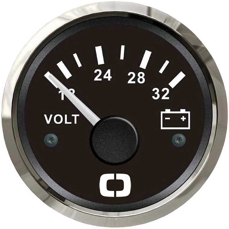 Voltmetro 18/32 V con quadrante nero e lunetta lucida.