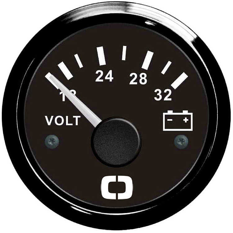 Voltmetro 18/32 V con quadrante nero e lunetta nera.